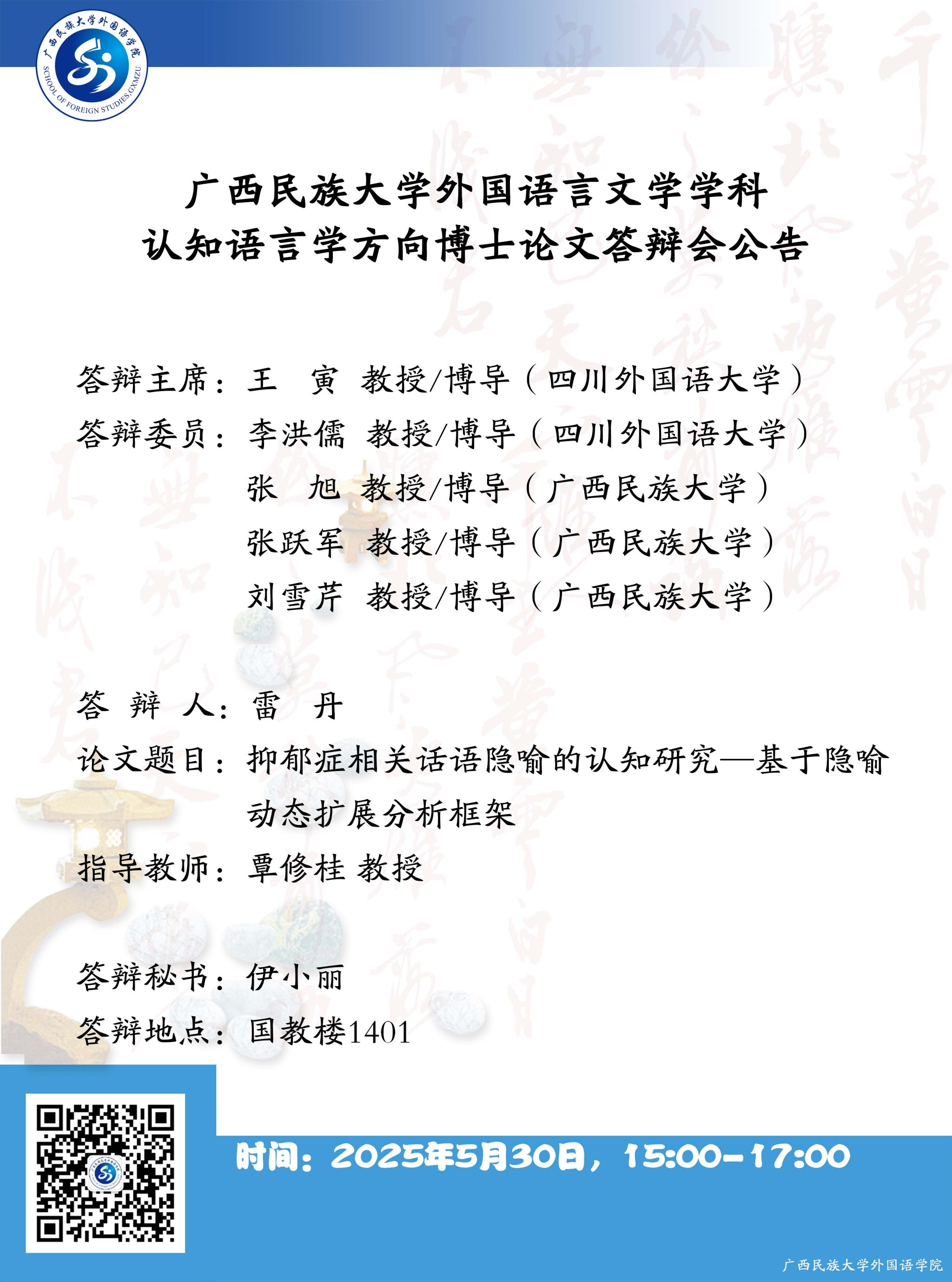 广西民族大学外国语言文学学科 认知语言学方向博士论文答辩会公告