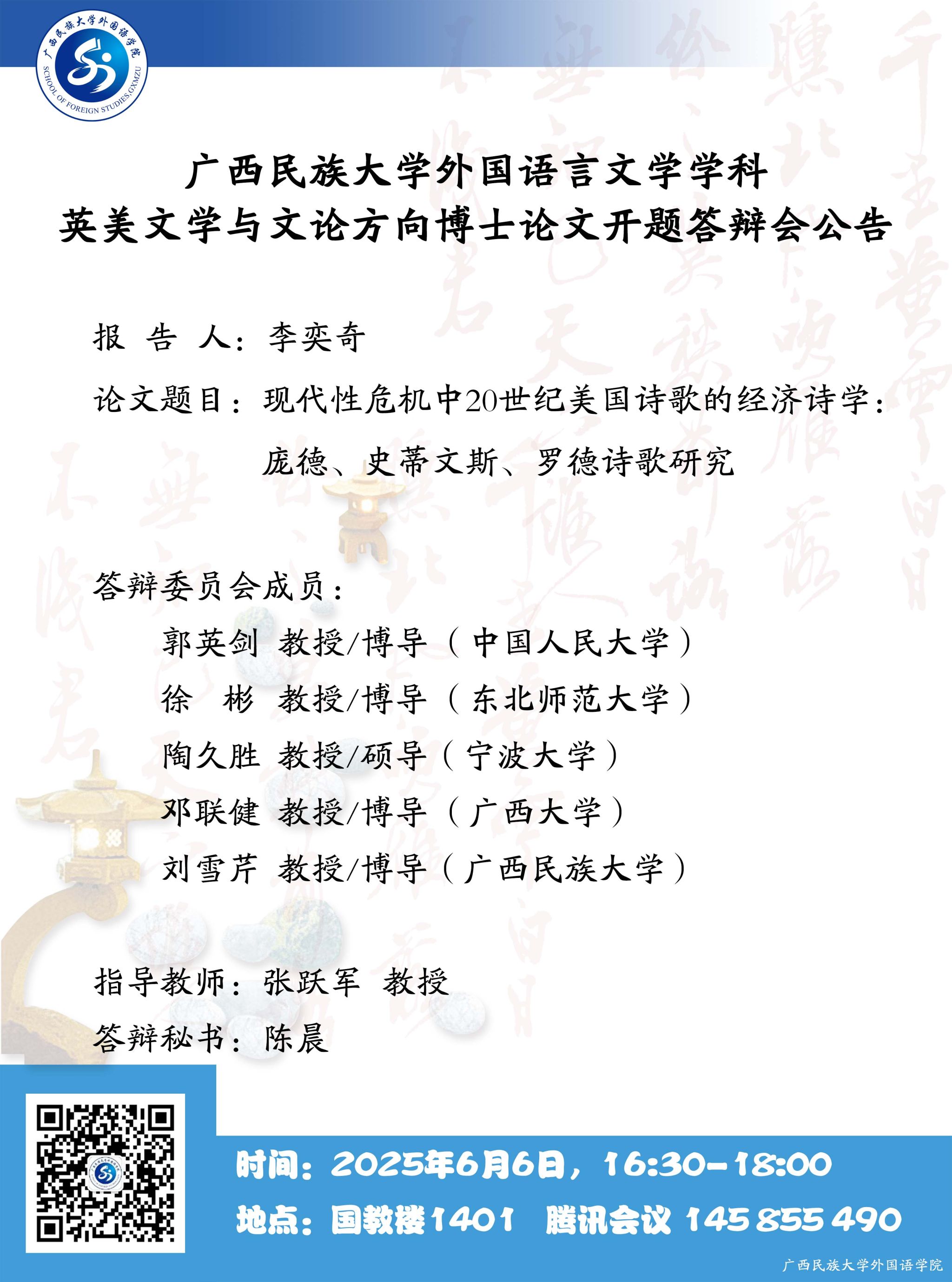 广西民族大学外国语言文学学科 英美文学与文论方向博士论文开题答辩会公告