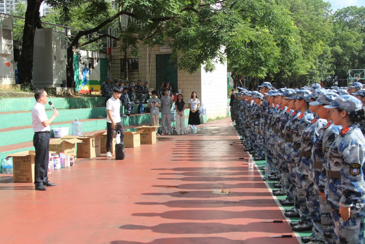 覃慧敏副书记走进队伍,细致询问新生训练强度、适应情况以及日常饮水与作息细节,她叮嘱同学们在高温天气下要注意防暑,有任何不适及时向教官、辅导员反映,学院会为同学们做好各项服务保障工作。