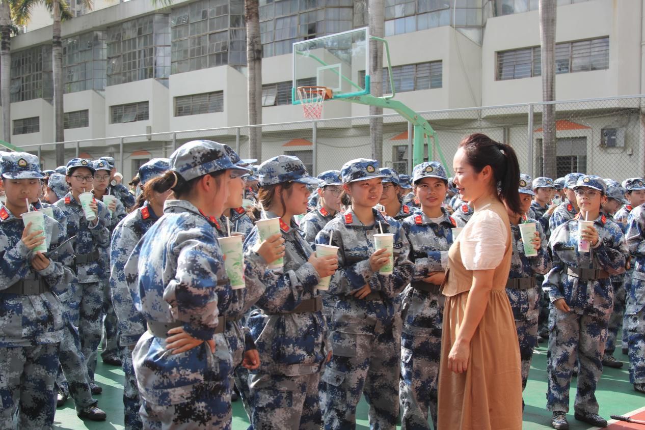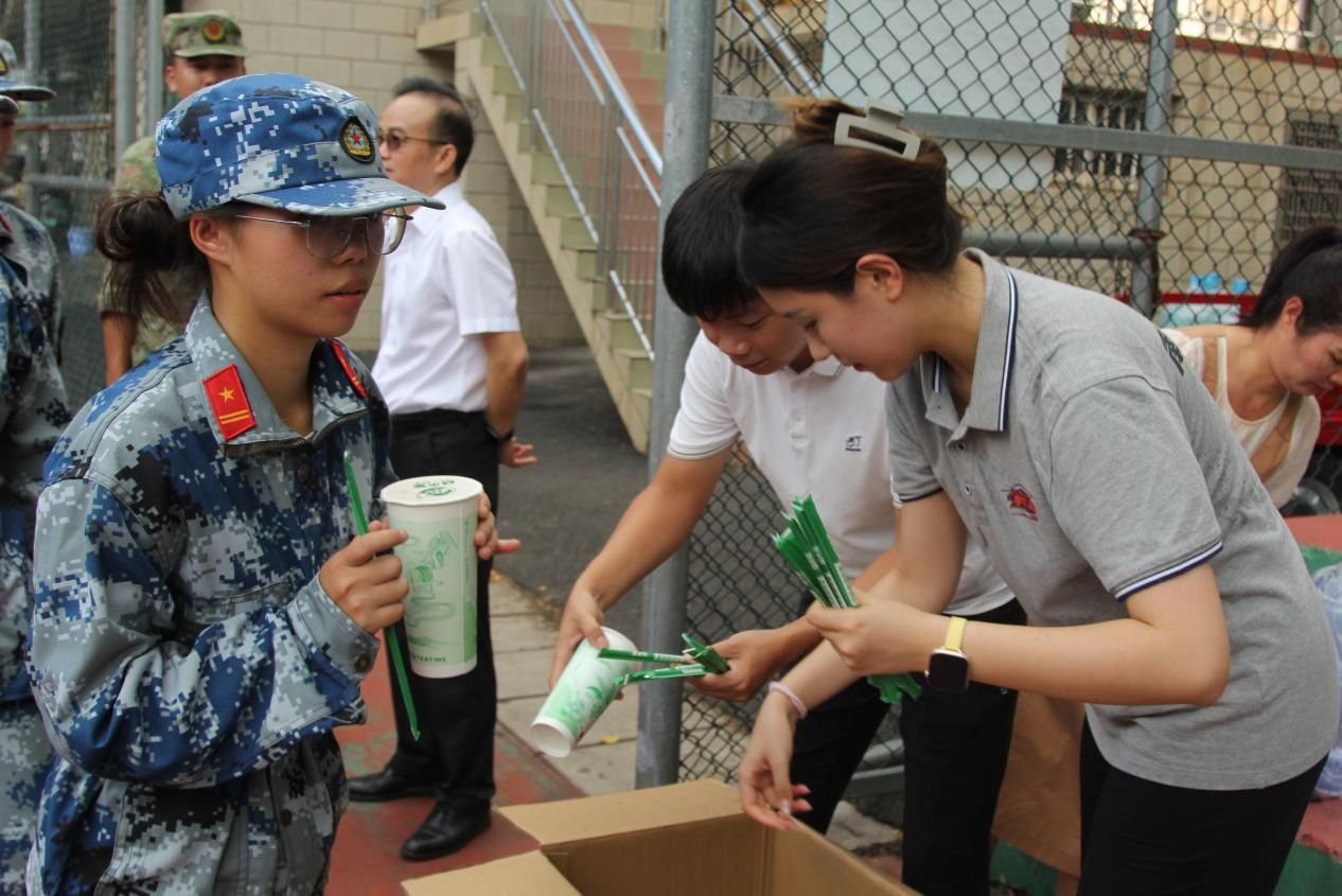 学院领导与老师们亲手将一杯杯凉意十足的饮品递到新生手中,配合着“训练辛苦了”“记得补充水分”的暖心叮嘱,让燥热与疲惫在瞬间消散。接过奶茶的新生们难掩惊喜,纷纷以笑容回应学院送来的这份“及时雨”般的清凉。