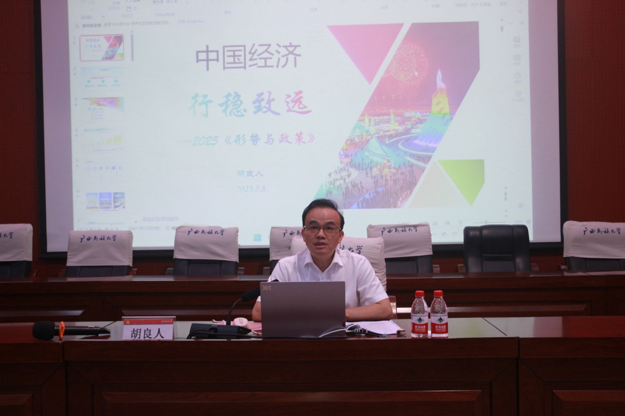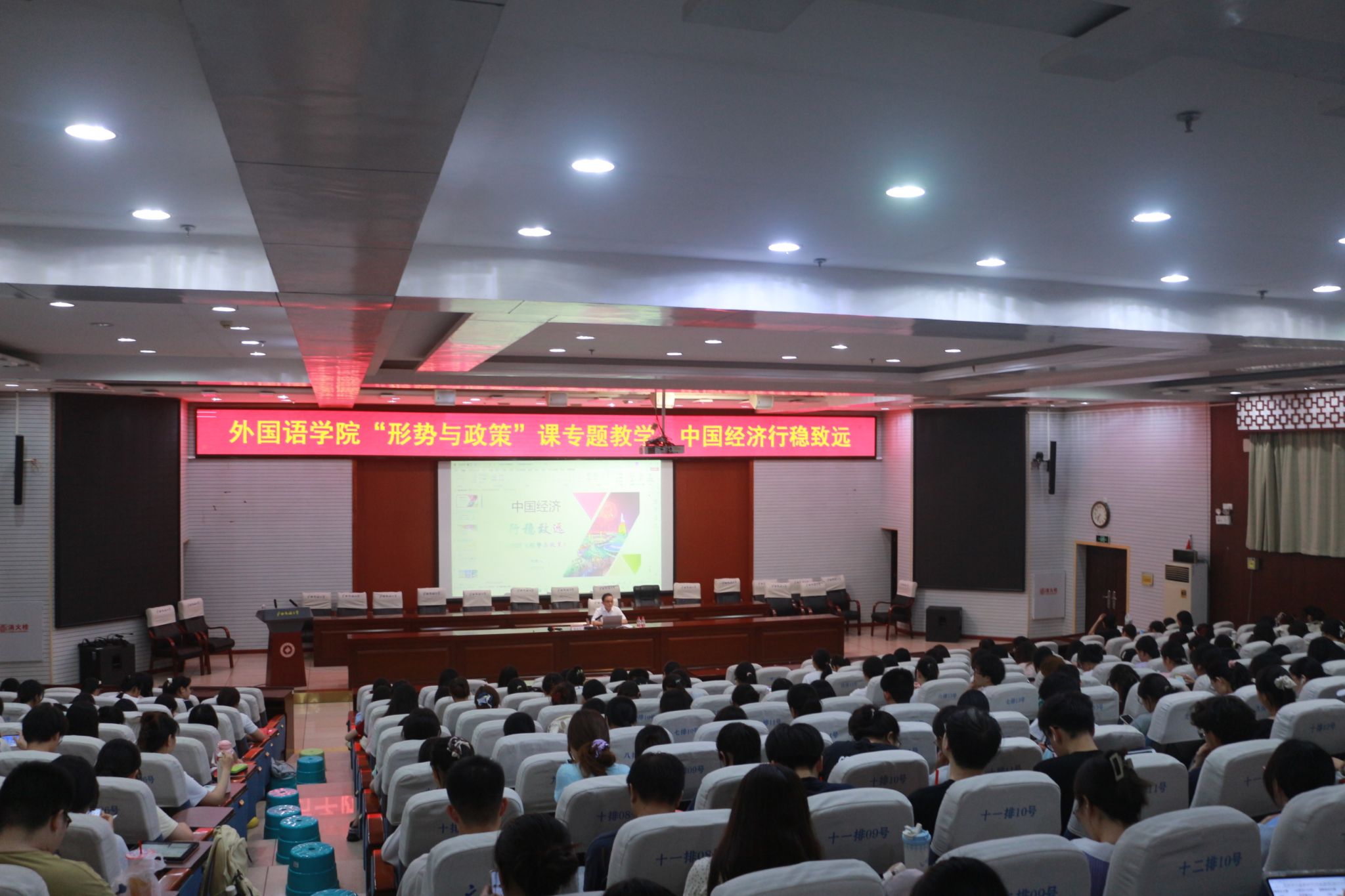 课堂上,胡良人书记围绕创新驱动、内需潜力、制度优势等核心要素展开分析,系统阐释新质生产力对经济高质量发展的推动作用,以及数字经济与实体经济深度融合带来的新机遇。针对外语专业特色,胡良人书记重点解析“外语专业如何服务中国经济高质量发展”“中国经济发展对国际合作的深远影响”等内容,着重强调外语专业学生在跨境贸易谈判、国际文化传播等领域的独特优势,鼓励青年学子密切关注国际经济形势,积极投身全球经济治理实践,为构建人类命运共同体贡献青春力量。