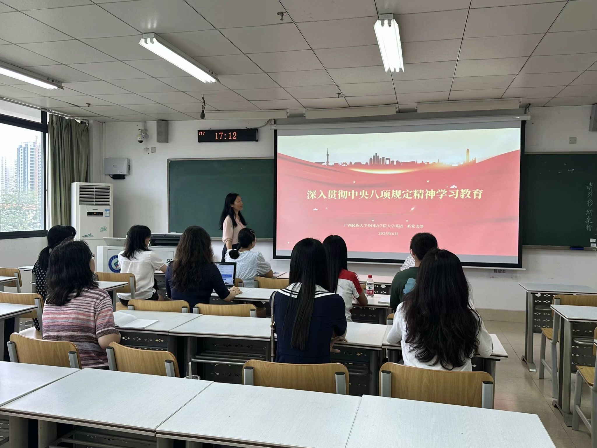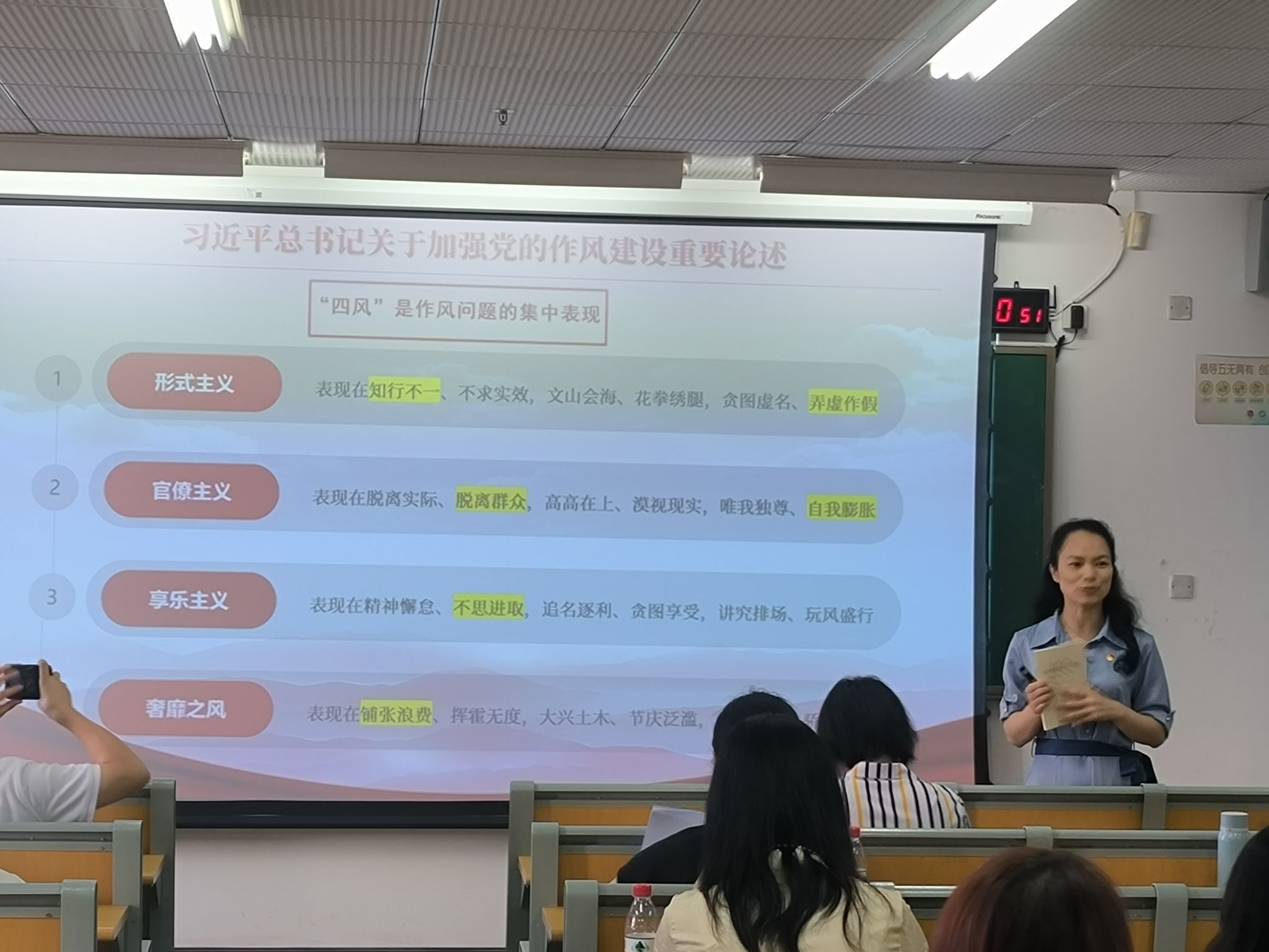 为深入贯彻中央八项规定精神学习教育,持续推进党风廉政建设。近期,我院党委组织领导班子成员开展专题党课活动,深入学习贯彻习近平总书记关于加强党的作风建设的重要论述以及中央八项规定精神。本次党课主讲人分别为党委书记胡良人、院长刘雪芹、党委副书记覃慧敏、副院长蓝艳芳、副院长潘艳红、党委委员王安民,各自所联系支部全体师生党员参加本次专题党课学习。