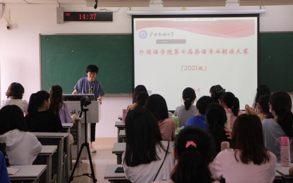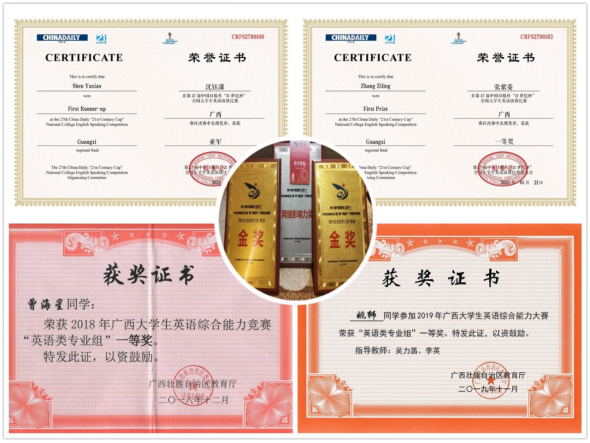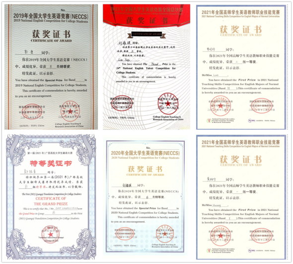 学生在各级各类专业竞赛中成绩优异,近五年共获省部级以上奖项70项。其中包括第三十届韩素音国际翻译大赛二等奖1项,第21届“外研社杯”全国英语辩论赛华南赛区三等奖1项,2019年“21世纪∙可口可乐杯”全国英语演讲比赛广西总决赛特等奖冠军1项,2022年“21世纪∙可口可乐杯”全国英语演讲比赛广西总决赛特等奖亚军1项,2019、2020、2021年全国大学生英语竞赛特等奖4项,2019年广西大学生综合英语能力大赛英语专业组一等奖1项,2018年广西大学生综合英语能力大赛英语专业组一等奖1项,第四届“互联网+”创新创业大赛广西赛区选拔赛铜奖1项。