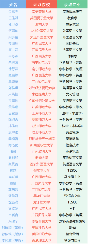 英语专业毕业生考研、考博成果显著,录取学校包括香港理工大学、英国爱丁堡大学、英国杜伦大学、英国纽卡斯尔大学、加拿大蒙特利尔大学、北京大学、中山大学、外交学院、广东外语外贸大学、北京语言大学、云南大学、南京师范大学、福建师范大学、华南理工大学等。