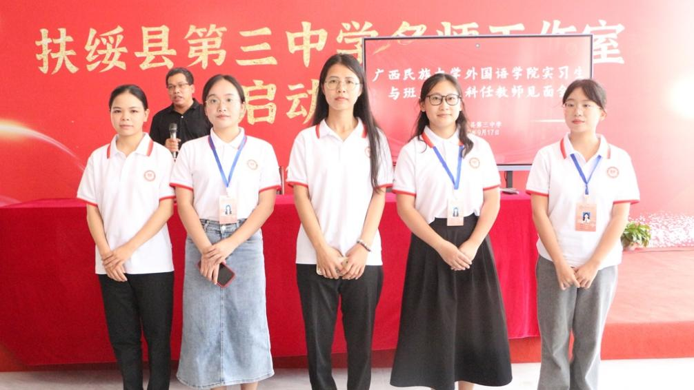 图7照片为目前已经在扶绥县第三中学工作的5位外院学子。其中,林妍妍已经成长为教学骨干,负责编写英语口语校本教材,多次在县级教学比赛中获奖。