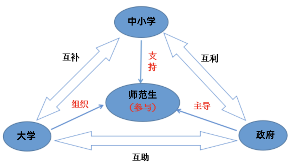 用一句话来概括“四位一体”育人模式的运行机制就是:政府主导、中小学支持、大学组织、师范生参与。各自的角色定位和分工如下:
