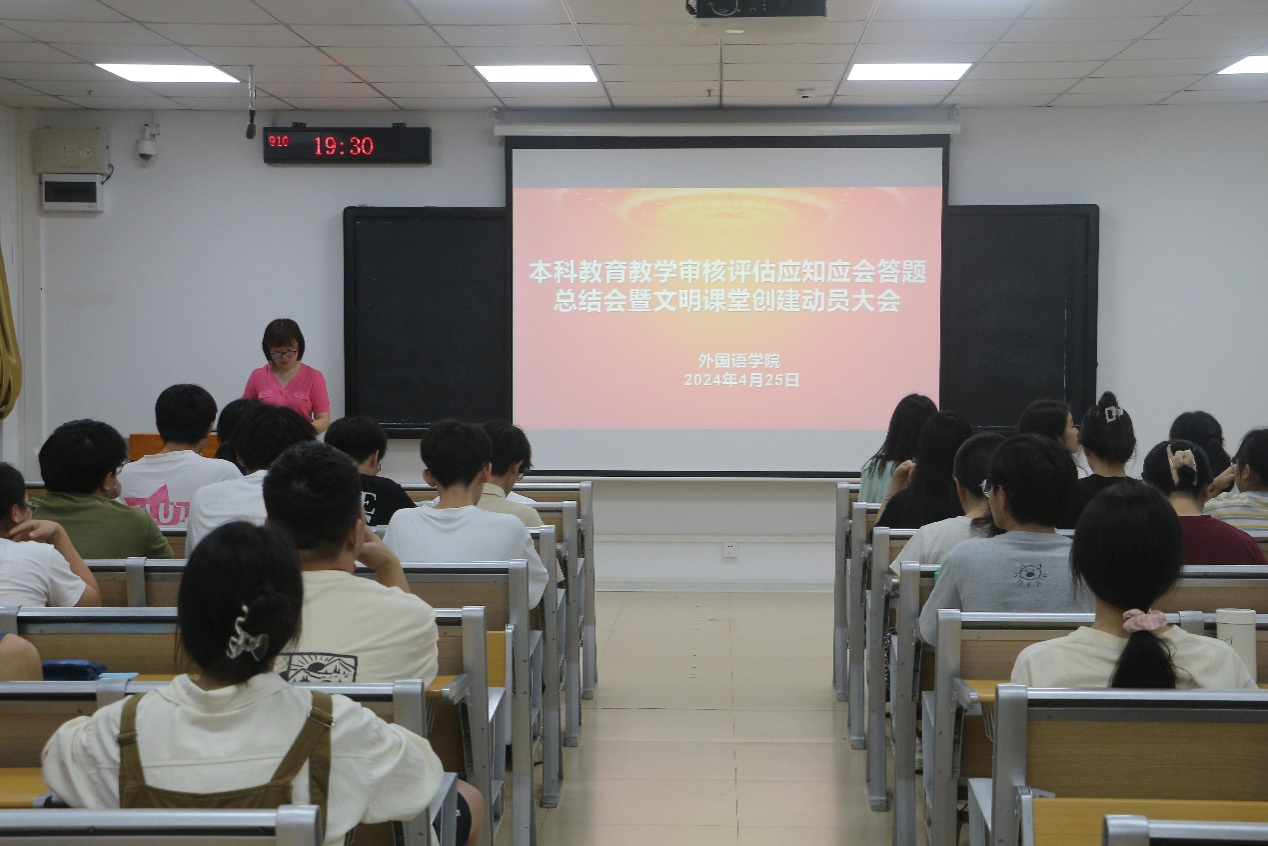 2024年4月25日下午,m88在线客服在国教楼910会议室召开 “本科教育教学审核评估应知应会答题总结会暨文明课堂创建动员大会”,学院副院长潘艳红到会指导,会议由团委副书记吕雅芬主持,学院各班班委参加。